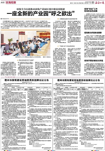 “计划到明年上半年,富海产业园的第一条公路就能建成。”5月24日,骄阳似火,在富海产业园区内,宝海东路项目的首批建设人员已经进驻,琼海市城投公司相关负责人高兴地介绍。