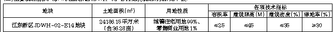 经海口市人民政府批准,海口市自然资源和规划局决定以挂牌方式出让一幅海口市江东新区JDWH-02-E14地块的国有建设用地使用权。现将有关事项公告如下:一、出让地块的基本情况和规划指标要求:(一)基本情况及宗地净地情况。本次挂牌出让的地块位于海口市江东新区JDWH-02-E14地块,土地面积为24186.15平方米(合36.28亩),土地用途为城镇住宅用地99%、零售商业用地1%,出让年限住宅70年、商业40年。目前该地块安置补偿落实到位、地上附着物已清表、土地权利清晰、无法律经济纠纷、土壤无污染,具备动工开发必需的条件。(二)主要规划指标。海口市江东新区JDWH-02-E14地块规划情况详见下表: