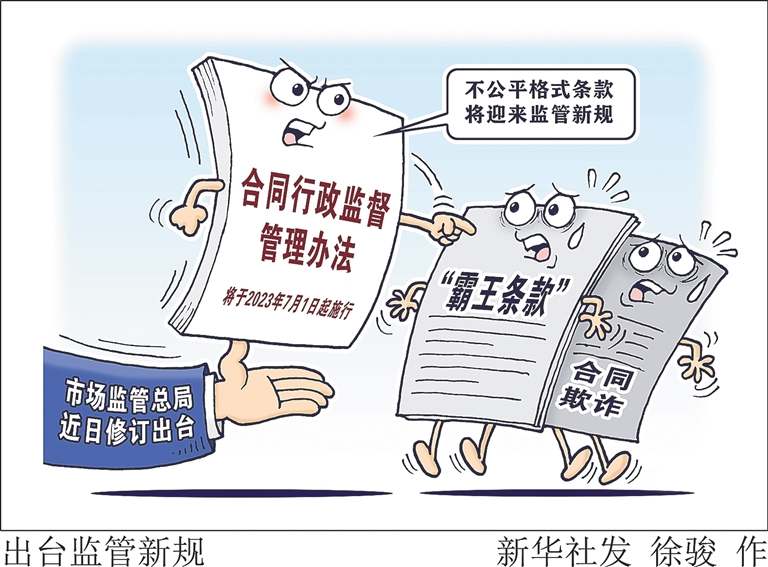 新华社北京5月26日电 (记者赵文君)“霸王条款”、合同欺诈等不公平格式条款将迎来监管新规。市场监管总局近日修订出台《合同行政监督管理办法》,将于今年7月1日起施行。