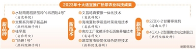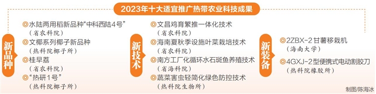 据了解,入选十大成果的新品种有水陆两用稻新品种“中科西陆4号”、文椰系列椰子新品种、桂早荔、“热研1号”;新技术有文昌鸡育繁推一体化技术、海南夏秋季设施叶菜栽培技术、南方工厂化循环水石斑鱼养殖技术和蔬菜害虫轻简化绿色防控技术;新的农业装备有2ZBX-2甘薯移栽机、4GXJ-2型便携式电动割胶刀。入选的十大科技助农典型包括:“热带名贵品种(东星斑)开发助力海南石斑鱼产业转型升级”“深远海智能养殖助力水产兴农”“黑山羊精准养殖集成技术推动产业升级”“科技小院助力科技成果转化”“科技支撑白沙黎族自治县天然橡胶产业发展”“轮作田菁绿肥节本增效技术助推三亚‘稳粮保供’”“水稻集约化机械育插秧技术助力琼海水稻提质增产”“科技嫁接,扎根一线,助力农业产业发展”“科技赋能热带设施甜瓜产业”“地瓜脱毒苗与配套高效技术打造全产业链品牌助农模式”。