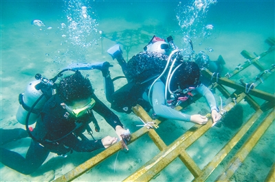 5月27日,潜水员在陵水黎族自治县分界洲岛附近海域移植珊瑚。
