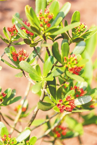 近日,在海南东寨港国家级自然保护区里的濒危红树植物红榄李迎来花期。据悉,红榄李是珍稀濒危红树植物、国家一级保护植物,被誉为红树林中的“大熊猫”。国内一度仅存14株。2014年,海南东寨港国家级自然保护区管理局成功培育出红榄李幼苗,并建立红榄李野外种植基地。如今这里已有超过20亩、约2300株的红榄李。