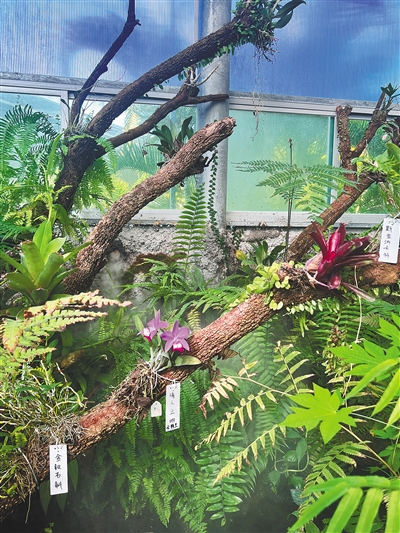 阳光洒落、水雾环绕、灌木丛生、蜂飞蝶舞……走在资源库里,不时可以看到一些微缩版的热带雨林景观,不同品种的兰花生长在枯树上、石缝中、水池旁,颇具野性之美。