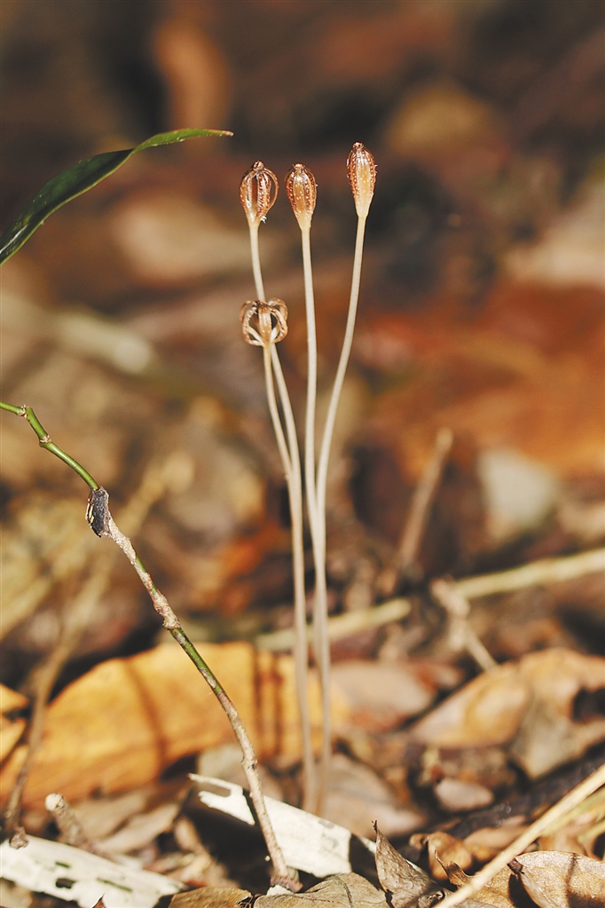 时间回拨至2021年5月,作为第二次全国重点保护野生植物资源调查海南省野生兰科植物资源专项调查组负责人,宋希强带领科研课题团队足迹几乎遍布海南热带雨林国家公园雨林深处。在略显郁闭的生境下,一个细弱的茎秆破土而出,亭亭玉立于腐叶中,没有一片叶片。未来得及见识花苞,此时茎秆顶部已孕育了近似黄豆大小的果实。腐生型兰科植物通常混在凌乱的枯叶堆里,这一通体几乎为棕褐色的“生面孔”并不起眼,却让眼尖的科研人员怦然心动。“在长期的野外调查工作中,我们的成员都练就了一双‘兰眼睛’。”调查组带队博士张哲说,他们总能在一片葱郁的植物中锁定目标。