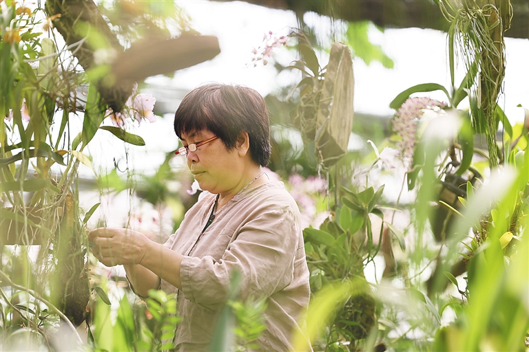 无论是陪伴了20余年的“老伙伴”,还是新近移栽的国外品种,李良珍总能如数家珍。兰生幽谷,在她看来,兰花从野生到家养,由于生态环境的变化,在栽培方面,就得在养根、壮苗、复花三个阶段上下足功夫,让它们更好地适应新的生长条件。李良珍也更乐于通过搭建吊篮、藤条、架设枯木等仿野外生境的方式,让兰花根茎舒展生长。