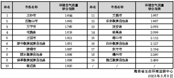 环境空气质量排名靠前的市县分别是三沙市、五指山市和万宁市,排名靠后的市县分别是昌江黎族自治县、儋州市和东方市。2023年4月全省19个市县环境空气质量排名如右: