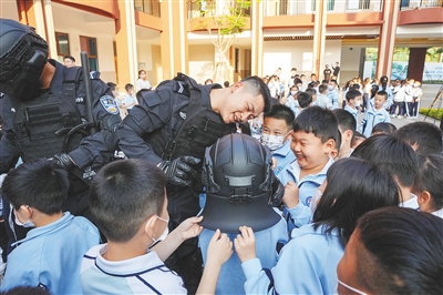 图3 在海口市滨海第九小学新埠学校,新埠海岸派出所联合海岸警察总队第一支队特警大队特警为学生们展示警用装备。本报记者 武威 摄