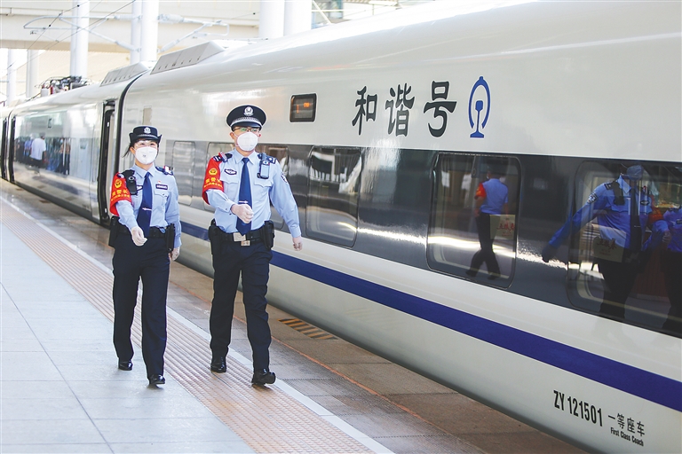图4 在三亚高铁站,乘警在对三亚站停靠动车进行外围巡查。(资料图)