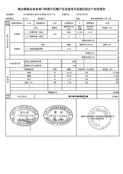 陵水县人民政府于2021年7月30日作出房屋征收决定(陵府〔2021〕67号)房屋征收决定,对陵水县五个片区棚户区改造项目征收范围内的国有土地上房屋进行征收。该项目依法选定的房地产价格评估机构为海南中正信房地产资产评估咨询有限公司。现对陵水县椰林镇棚户区改造项目南门岭片区北斗东二路四巷现场编号NC16-1做情况说明;该土地房屋存在争议,原产权人:龙关琼(已故);龙秋生(继承人)身份证:460034195202070456;龙关琼与龙秋生为父子关系。经龙秋生提供的相关材料:宅基用地批准书,椰林镇城东村委会证明文件;现场编号NC16-1原属于龙秋生的房屋(瓦房),被他人拆除重建(现场瓦房一间)此事当事人单方面陈述。经了解,该土地与房屋存在争议,龙秋生本人也承认该土地与房屋存在争议,却不配合提供与争议人的个人信息。现将下列土地与房屋所属情况、分户评估报告进行公告,公告期为30日,公告期满视为完成转交。请下列被征收人、被征收房屋所有权人或利害关系人持相关证明材料,到本项目现场办公室领取分户评估报告。被征收人、被征收房屋所有权人对征收价格评估结果有异议的,应当自公告期满10个工作日内,向本项目评估机构海南中正信房地产资产评估咨询有限公司申请复核评估;对评估机构复核结果仍有异议的,应当自收到复核结果之日起10个工作日内,向海南省房地产估价师协会房地产价格评估专家委员会申请鉴定。同时,请被征收人或被征收房屋所有权人、利害关系人持身份证明和其他相关证明材料,到本项目现场办公室协谈征收补偿的有关事宜。项目部地址:海南省陵水黎族自治县糖厂安置小区棚户区改造项目部4号办公室,联系电话:089883090008。