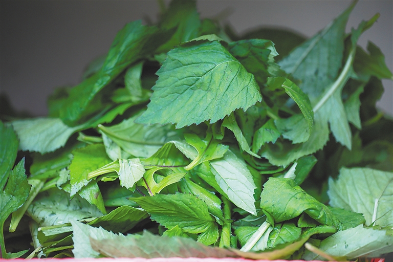 生长在槟榔树下的捞叶,是琼中老百姓餐桌上不可少的角儿。捞叶,又名山篓、假篓,也被当地人称为黎家绿叶宝,早期黎苗同胞认为这种野菜有祛风利湿,消肿止痛,清肺止咳的作用。捞叶形似爱心,叶面纹路纵横,只要稍稍靠近,就能闻到一股特殊的香气。入口先迸发出一股浓郁的辛香,直冲鼻腔,之后冒出微微的酸涩,口感与紫苏相似,再嚼两口,口腔中只剩甘甜的回味。可以全株入膳,也可作为香料提鲜。