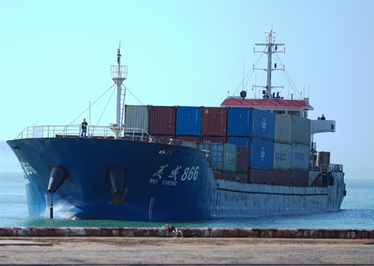 图1载有离岛免税商品的“穿梭巴士”驳船驶入海口港集装箱码头。本报记者 张茂 摄