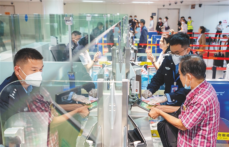 图4在海口美兰国际机场,边检站工作人员为旅客办理免签入境手续。本报记者 袁琛 摄