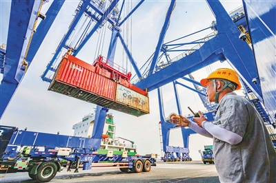 图7在洋浦经济开发区国际集装箱码头,工人指挥集装箱有序装船。本报记者 陈元才 摄