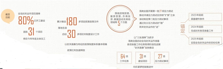一项一项有序落地,一件一件干好干成。以“三张清单”为抓手,如今,海南全面启动全岛封关运作准备,各项准备工作任务取得阶段性进展,“封关画像”加快推动,64项工作任务、31项建设项目和27项压力测试事项均在紧锣密鼓推进中。