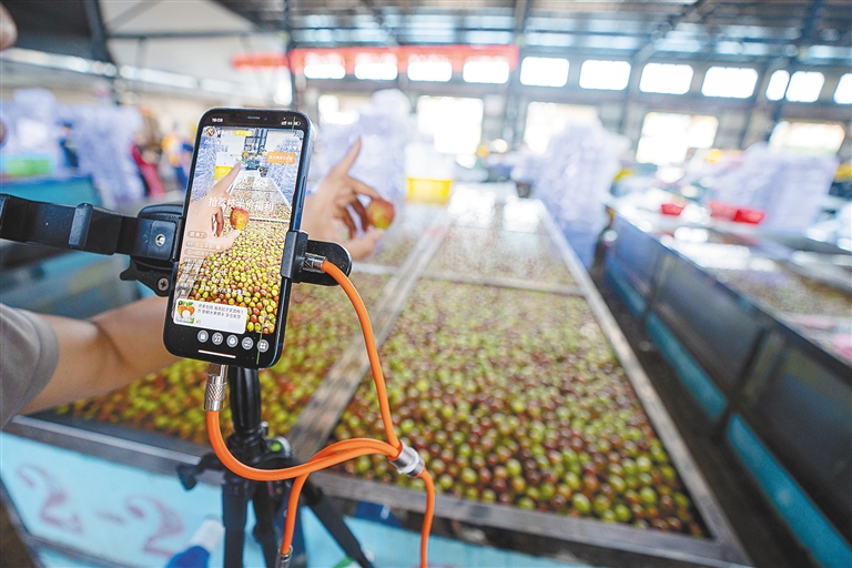 ③ 5月25日,在海口市琼山区三门坡镇的海南红明农产品(荔枝)交易中心,农户直播卖荔枝。本报记者 袁琛 摄