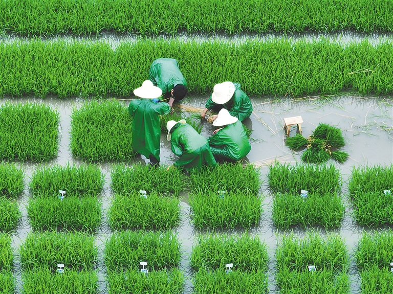 图为6月5日,农民在江苏里下河地区农科所(扬州市农科院)的试验田里劳作。