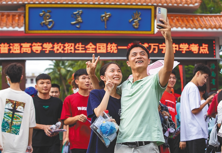 ④6月7日,在万宁中学考点,考试结束后家长和考生一起留影。 本报记者 袁琛 摄