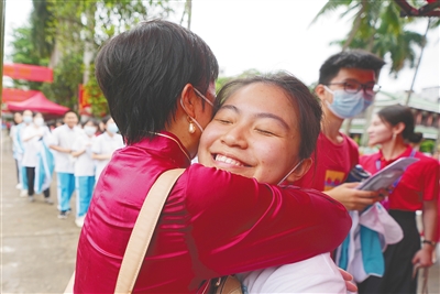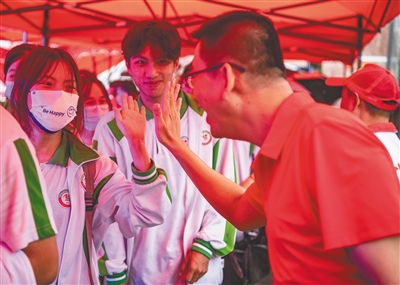 ③6月7日,在海南中学高中部考点,老师和考生一起加油鼓劲,预祝高考顺利。本报记者 张茂 摄