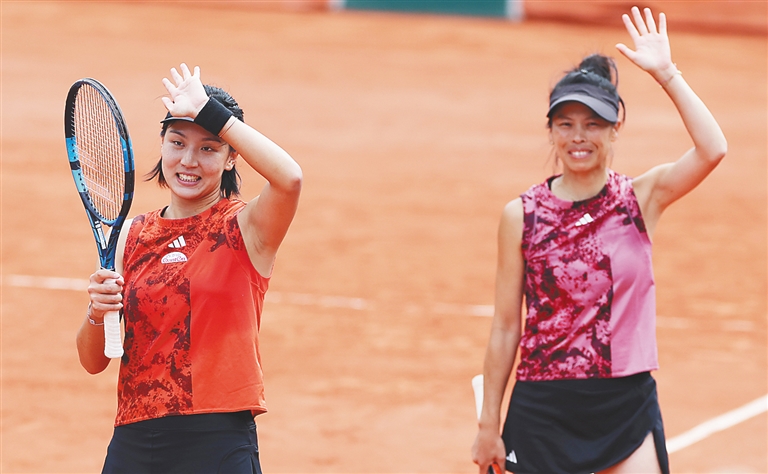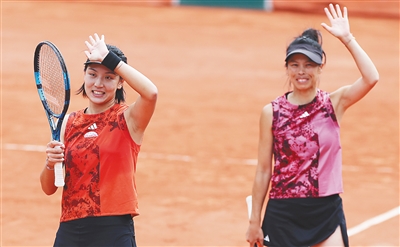 6月7日,在2023法国网球公开赛女子双打四分之一决赛中,王欣瑜(中国)/谢淑薇(中国台北)以2比0战胜俄罗斯组合库德梅托娃/萨姆索诺娃,晋级半决赛。图为王欣瑜(左)/谢淑薇庆祝胜利。新华社记者 高静 摄