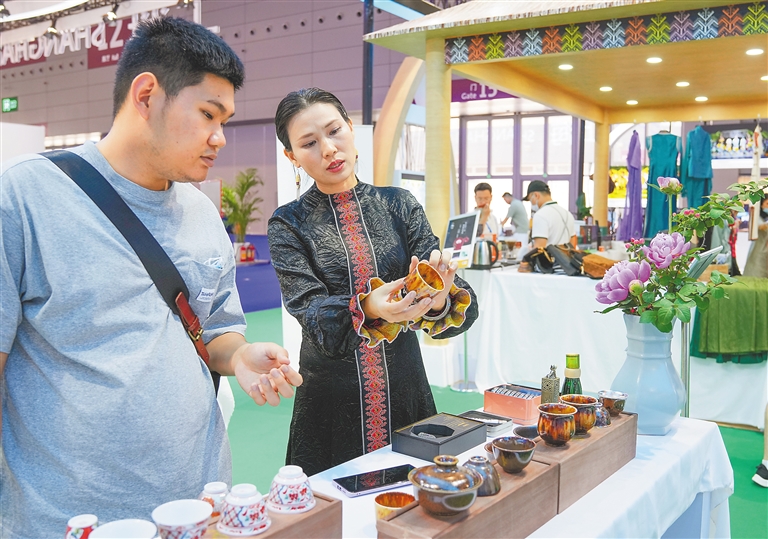 “这个海南的红泥陶瓷很特别,能看到‘微观世界’!”北京的参展商游卫东拿着50倍的放大镜细细打量着杯身花纹,镜头下的陶瓷显现出一朵朵独特的“金属花”。