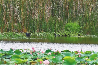 “这次是在园区内的莲花池里发现的。”昌江海尾国家湿地公园(试点)管理中心副主任薛美丽介绍,她在巡护过程中拍下了一对紫水鸡成鸟带着6只幼崽出来觅食的画面,“紫水鸡非常敏感,蹲守了一个多小时才拍到。”