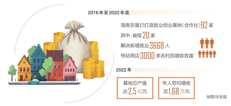根据最新数据统计,2016年至2022年底,海南农垦已打造就业创业基地(合作社)92家,其中省级20家,解决新增就业3668人,带动周边3000多名村民增收致富。其中,2022年基地总产值达2.5亿元,年人劳均增收近1.68万元。