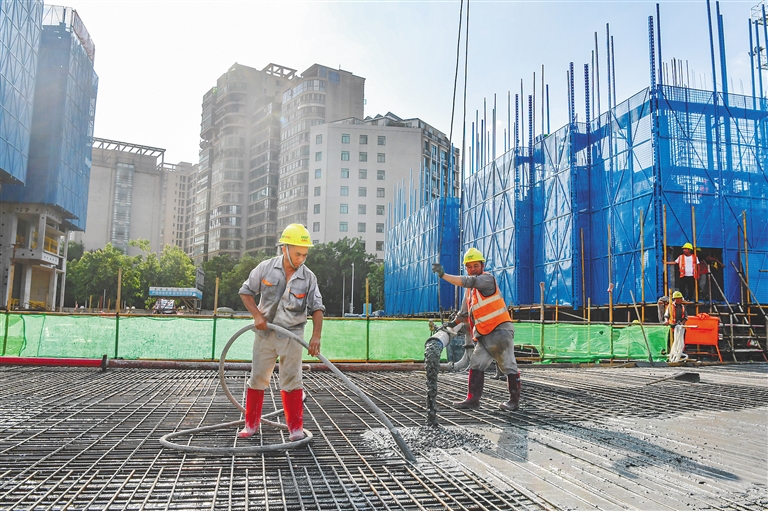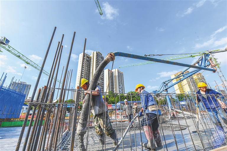 浇灌顶板,全力施工……6月4日,海口市龙华区,海垦·安悦兰亭安居房项目,2号楼地下室顶板上,工人紧锣密鼓浇灌完580多立方米混凝土,项目8栋住宅楼全面冲出“正负零”。