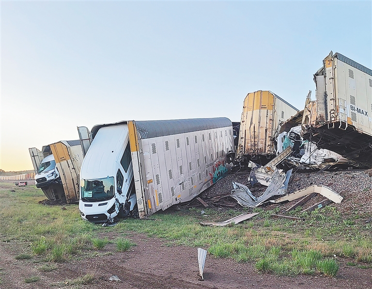 据美联社8日报道,一列运载汽车的货运列车7日在美国西南部亚利桑那州北部脱轨,导致23节车厢和其中装载的汽车严重损毁。新华社/美联