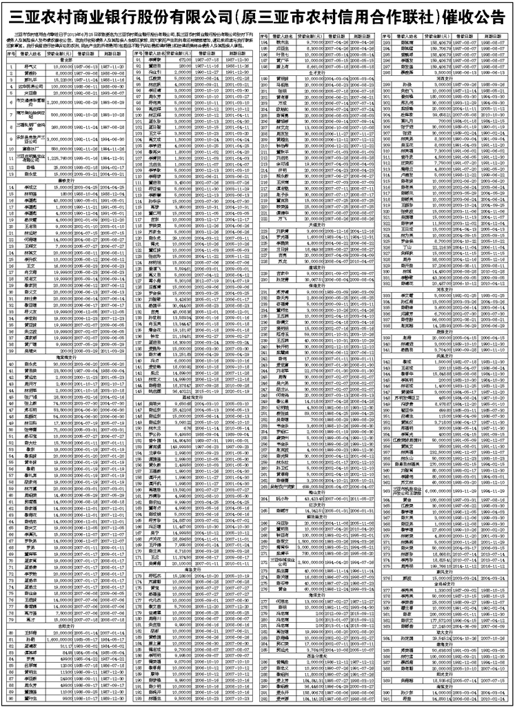 三亚市农村信用合作联社已于2013年6月25日改制更名为三亚农村商业银行股份有限公司,现三亚农村商业银行股份有限公司针对下列债务人及其担保人发布债权催收公告。在我行收到债务人及其担保人全额还款前,因欠款而产生的利息还将继续增加,请见报后速与我行联系还款事宜。我行保留进行法律诉讼的权利,因此产生的所有费用(包括但不限于诉讼费和律师费)和法律后果将由债务人及其担保人承担。