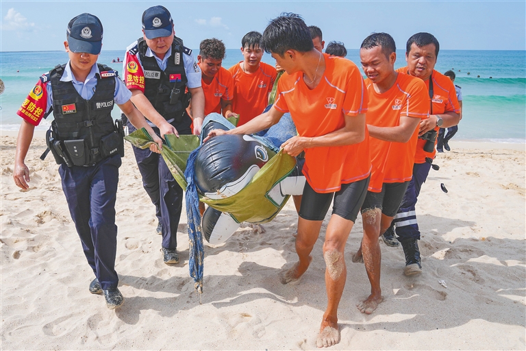 6月9日,三亚大东海举行海洋动物救助演练活动和防溺水演练活动。