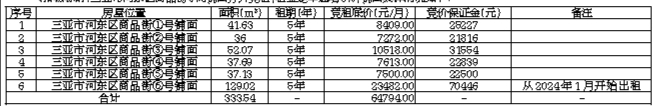 二、租赁期限:五年。三、报名时间:自公告之日起至7月3日(工作日),有意向竞租者请前往海南省烟草公司三亚公司办公楼一楼后勤服务中心登记报名,我司将提供《海南省烟草公司三亚公司商品街铺面公开竞价招租须知》和《房屋租赁合同》范本,并于7月3日15:00组织统一看房。地址:海南省三亚市凤凰路152号,联系人:魏女士,联系电话:13976229756。四、竞价时间:2023年7月4日15:00。五、竞价地点:海南省三亚市三亚烟草公司六楼。六、报名材料:竞租人为单位,需提交营业执照原件及复印件(加盖公章)、法人代表有效的居民身份证原件及复印件;竞租人为自然人,需提交有效的居民身份证原件及复印件;委托他人报名,还需提交代理人有效的居民身份证原件及复印件及授权委托书(签字或盖章);竞租保证金转账证明;资信证明,以全国信用系统查询结果为准。七、保证金:各个竞租保证金详见标的中各铺面保证金,保证金不计利息,竞租者须在报名期限内交纳,否则不得参加竞租,竞租者需凭保证金存缴凭证到三亚烟草公司二楼财务科领取保证金收据。竞得者须签订《房屋租赁合同》,未竞得者全额退还保证金。如竞得者违约,保证金不予退还。账户:开户单位:海南省烟草公司三亚公司;开户银行:海南省三亚市农行;银行账号:21751001040012600。八、备注:本次铺面招租经营项目只允许用于经营和办公等活动,不得用于从事下列项目:国家明文规定禁止从事的生产经营项目,政府管理部门要求不得经营的项目,农药、有害化工、易燃易爆物品等。九、本公告最终解释权归海南省烟草公司三亚公司所有。
