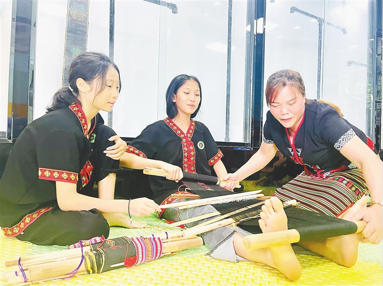 换上黎族服饰,林爱花准时来到学校织锦室,孩子们已经摆好织布机在等上课。她迅速进入角色,仿佛跟在农家乐忙碌的老板娘并非同一个人。