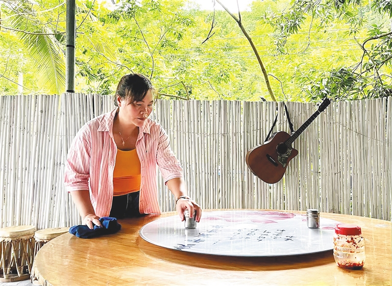 林爱花在经营农家乐的过程中,巧妙融入黎锦等黎族文化元素。农家乐的内外墙上有呈现黎族人生活场景的壁画,近2米高的护栏上挂着精美的黎族服饰和几把木吉他。闲暇之时,她便抱着吉他哼唱几首黎族民歌。有游客称她为“文艺女青年”,甚至有人远道而来只为与她合奏一曲。