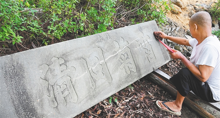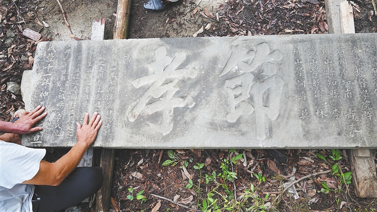 “节孝”“霜菊同清”“咸丰十一年仲夏月榖旦”……村民陈星儒拿着湿抹布在碑面上擦拭,石碑上的字迹愈发清晰起来。“这是160多年前,海南名人张岳崧的次子张钟彦为潭堀村的周氏、李氏婆媳所刻的。”陈星儒介绍。