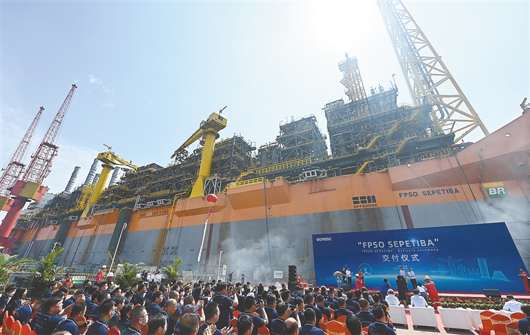 6月12日,海上浮式生产储卸油船(FPSO)“SEPETIBA”轮在天津完成交付并将于近日离港启运巴西。“SEPETIBA”轮总长333米,总高64米,总宽60米,储油能力达200万桶,最大排水量45万吨,可实现海上石油、天然气等能源的开采、加工、储存、外运,被称为“海上油气巨无霸”,是开采深海油气资源的高端大型海洋工程装备。图为交付仪式现场。