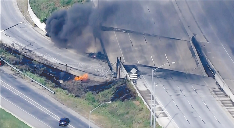 美国宾夕法尼亚州费城11日发生一辆油罐车起火后州际公路路段垮塌事故,对当地交通造成严重影响。事发路段系美国95号州际公路一处地道桥。95号州际公路是贯穿美国东海岸的交通动脉。新华社/美联