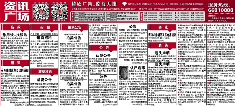 我司位于海口市海秀东路19号首力大厦一楼铺面现对外招租(面积约1400平方米),采取设底价竞租方式,招租底价约为每平方米65元,有意承租者请于2023年6月14日前与我司有关人员联系了解招租要求及索取相关资料,过期无效。