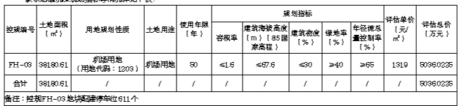 本次挂牌出让宗地位于凤凰机场北侧FH-03地块内,面积38180.61平方米,用地四至及界址坐标详见地块勘测定界图。经核查《三亚市总体规划(空间类2015—2030)》(省政府同意入库版),该宗地用地规划性质为城镇建设用地。同时,经核查《三亚市凤凰机场北侧约163亩用地(FH-01、FH-02和FH-03地块)规划修改分图则》,该宗地规划用地性质为机场用地(用地代码:1203),对应土地用途为机场用地。