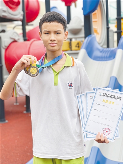 前段时间,张宇博站上了海南省第八届残疾人运动会暨第五届特殊奥林匹克运动会的领奖台。他在男子听障4×100米和4×400米接力赛中获得了两枚铜牌。