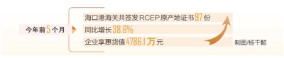 “我们公司主要签领的是对日本的RCEP原产地证书,去年经过两次降税安排后,客户享受到的关税优惠幅度达到18.6%,为我们稳定客户资源起到了积极作用。”海南欣龙无纺股份有限公司国际贸易业务总经理刘翔表示,希望未来能实现RCEP与自贸港优惠政策叠加,为公司扩大出口起到推动作用。