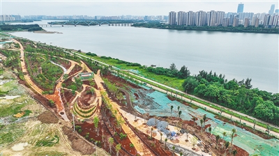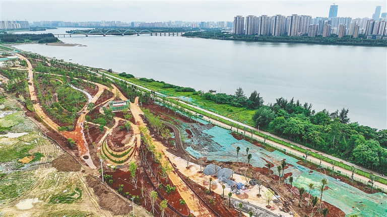 6月12日,航拍初具雏形的南渡江门户公园。该项目计划今年年底前完工。