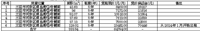 一、招租标的:三亚市河东区商品街6间铺面分开竞租,租金逐年递增3%,铺面具体情况如下: