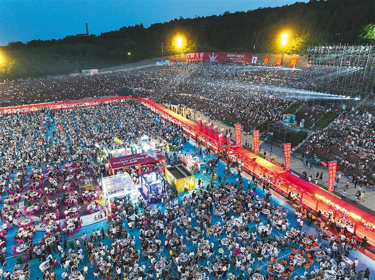 6月13日至14日,第23届中国·盱眙国际龙虾节万人龙虾宴在江苏盱眙举行,预计将消费数十吨小龙虾。据介绍,盱眙全县有21万人从事小龙虾产业,小龙虾养殖面积91万亩,2022年总产值达202亿元。近年来,盱眙通过实施种源科技攻关、规模种养拓面提质、标准化体系建设等,推动产业融合发展,不断擦亮富民小龙虾的“金字招牌”。图为市民和游客参加万人龙虾宴。