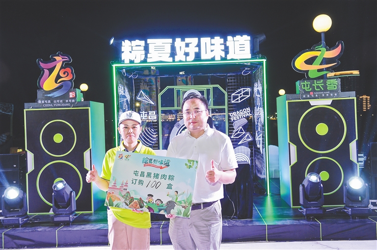 当晚,屯昌老牌餐饮企业、粽子厂商携带包装精美的正宗屯昌黑猪肉粽礼盒来到现场。在美食试吃环节,吸引市民游客纷纷试吃、购买。“我们在当地经营酒店、餐馆多年,专门养殖一批屯昌黑猪,精选优质黑猪肉制成端午粽子礼盒。这次来海口,希望让更多人感受到屯昌住宿、餐饮企业的诚意,多来屯昌游玩。”现场一名屯昌餐饮企业负责人说。