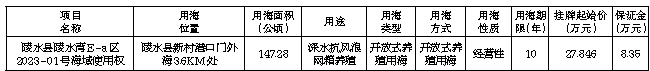 根据《中华人民共和国海域使用管理法》《海南省实施〈中华人民共和国海域使用管理法〉办法》和《海南省海域使用权审批出让管理办法》及有关法律法规规定,经陵水黎族自治县人民政府批准,陵水黎族自治县行政审批服务局决定以挂牌方式公开出让陵水县陵水湾E-a区2023-01号海域使用权。现将有关事项公告如下: