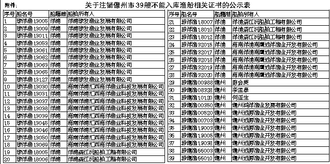 附件:关于注销儋州市39艘不能入库渔船相关证书的公告表