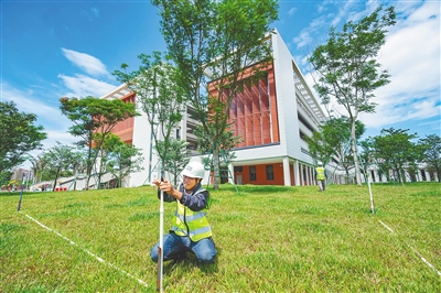 海南大学观澜湖校区(一期)项目建成后,工人近日在忙着绿化施工。该校区占地675亩,一期项目主要建设教学楼、宿舍楼及室内外配套设施等,可满足2000名学生教学需求和4000名学生生活需求。
