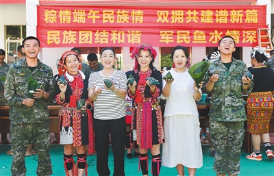 6月21日,五指山市毛阳镇毛兴村部分村民、驻地部队官兵、市退役军人事务局全体干部职工欢聚一堂,齐包“同心”粽。通讯员 张江英 摄