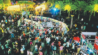 夏夜,定安县沿江公园热闹非凡:现龙坊、新泰来等经典定安粽子品牌展销台前,游客争相订购;乡村振兴新兴品牌水塔咖啡等摊位前,众人排起长队品尝;县级非遗“对岁粿习俗”展示区,龙、鸟等造型生动的点心,令人不禁停下脚步欣赏……