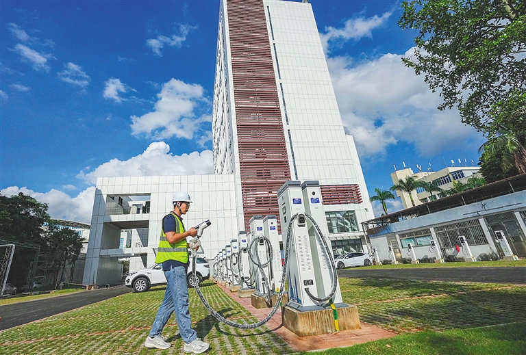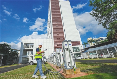 近日,由海南控股旗下海控能建和中铁建设联合承建的海南省人民医院医教协同项目顺利通过竣工验收,计划今年9月投入使用。海南省人民医院医教协同项目是我省首家在医院内建设临床医学院的改革示范项目,总建筑面积5万多平方米。图为工作人员在检查新能源汽车充电桩。
